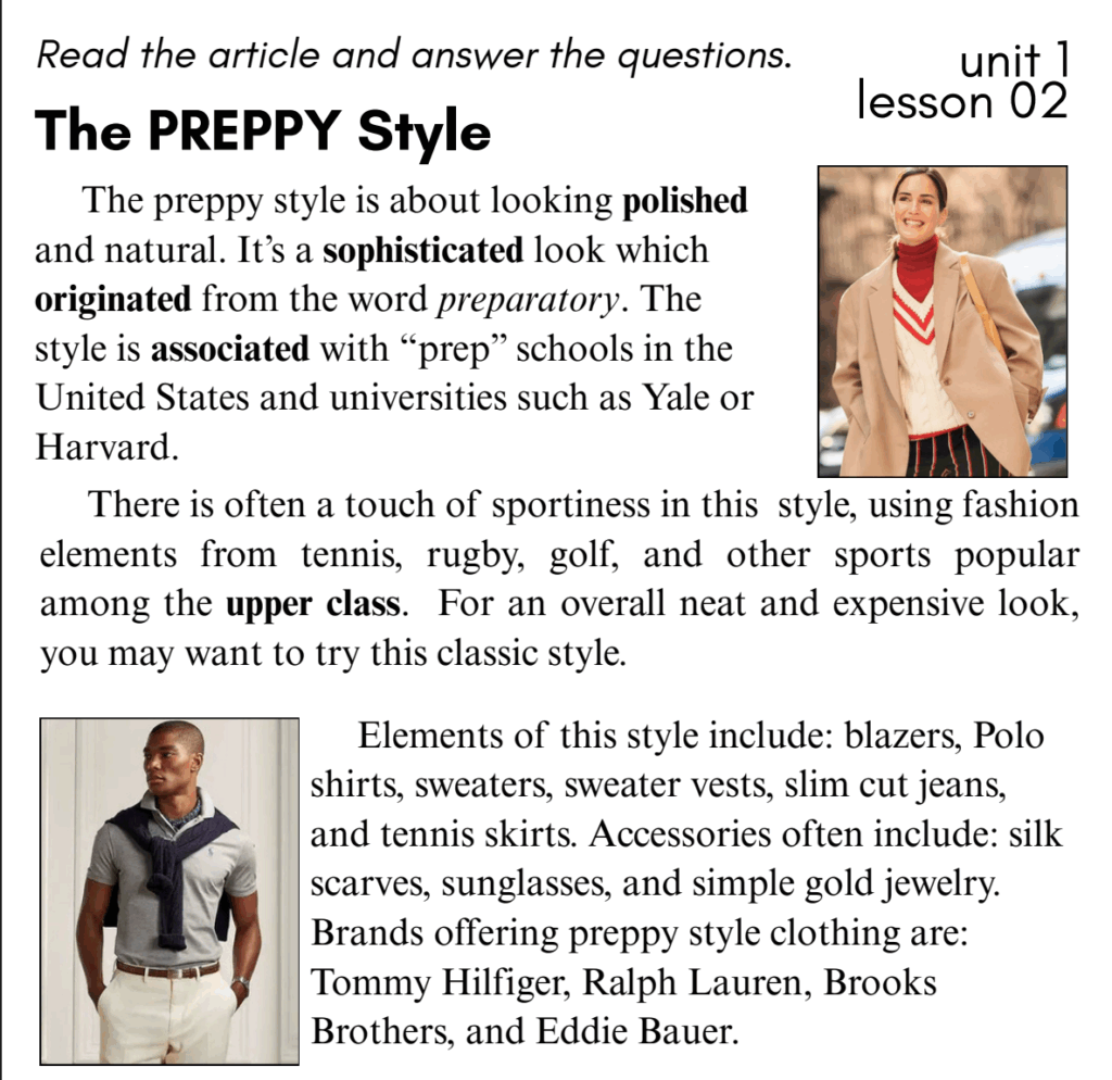 - 「PREPPY Style(プレッピースタイル)」などの具体的なファッションスタイルを題材に、英語の長文を読み解き、質問に答える実践的な練習を行います